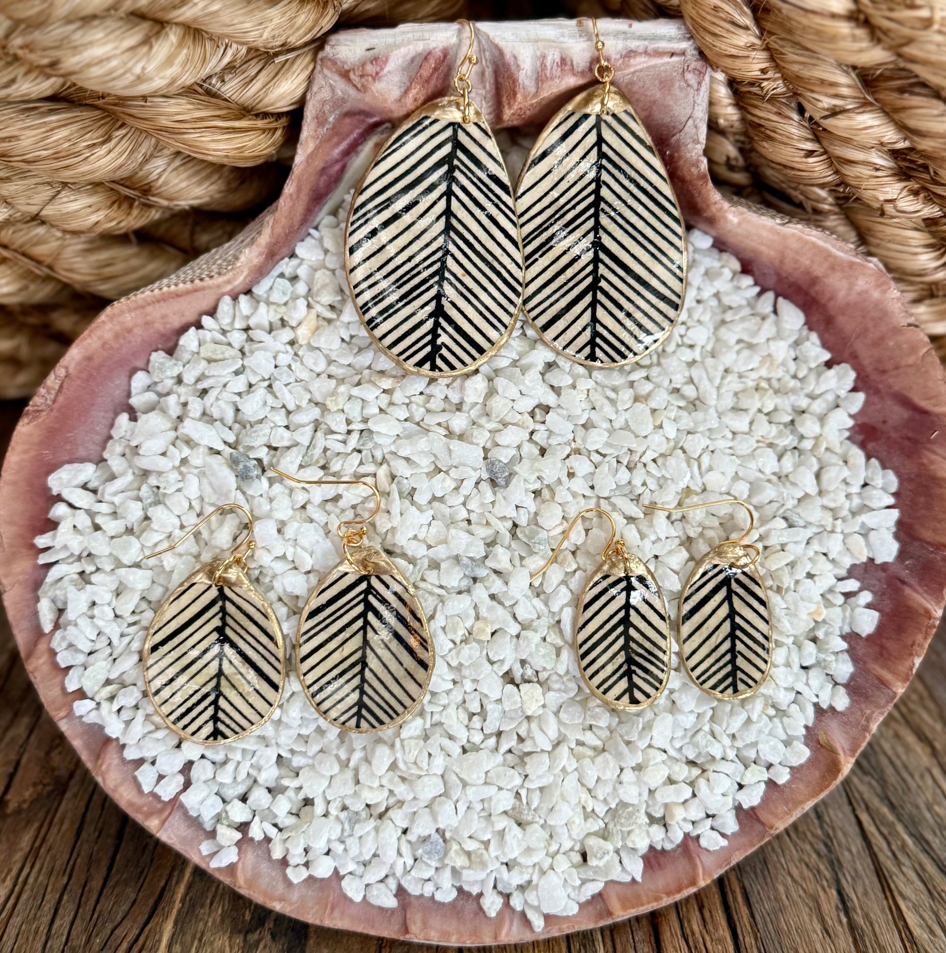 One of our best selling SheShells, these have a neutral background and black design. Shells are approximately 1.5”- 2.5” tall and are very lightweight. The backside of the shells has been left natural. As always, they come with our signature gift wrap!