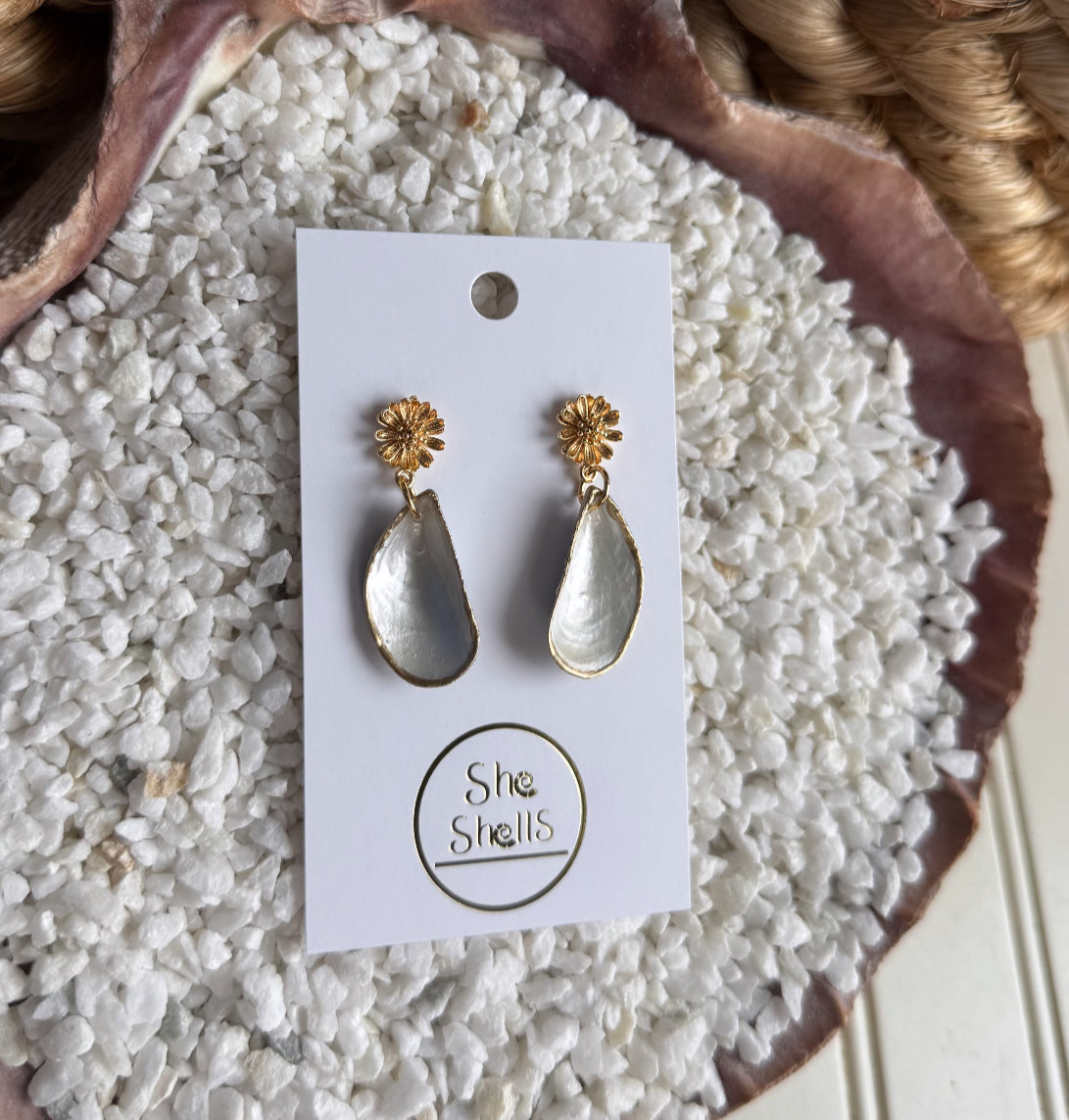 From our Amelia Island Collection, these SheShells are a great neutral option and will add elegance to any outfit! The shells have a pearl finish on the front and are topped with a small gold flower design. Approximately 1.5-2.5” tall and the shells are almost weightless!
