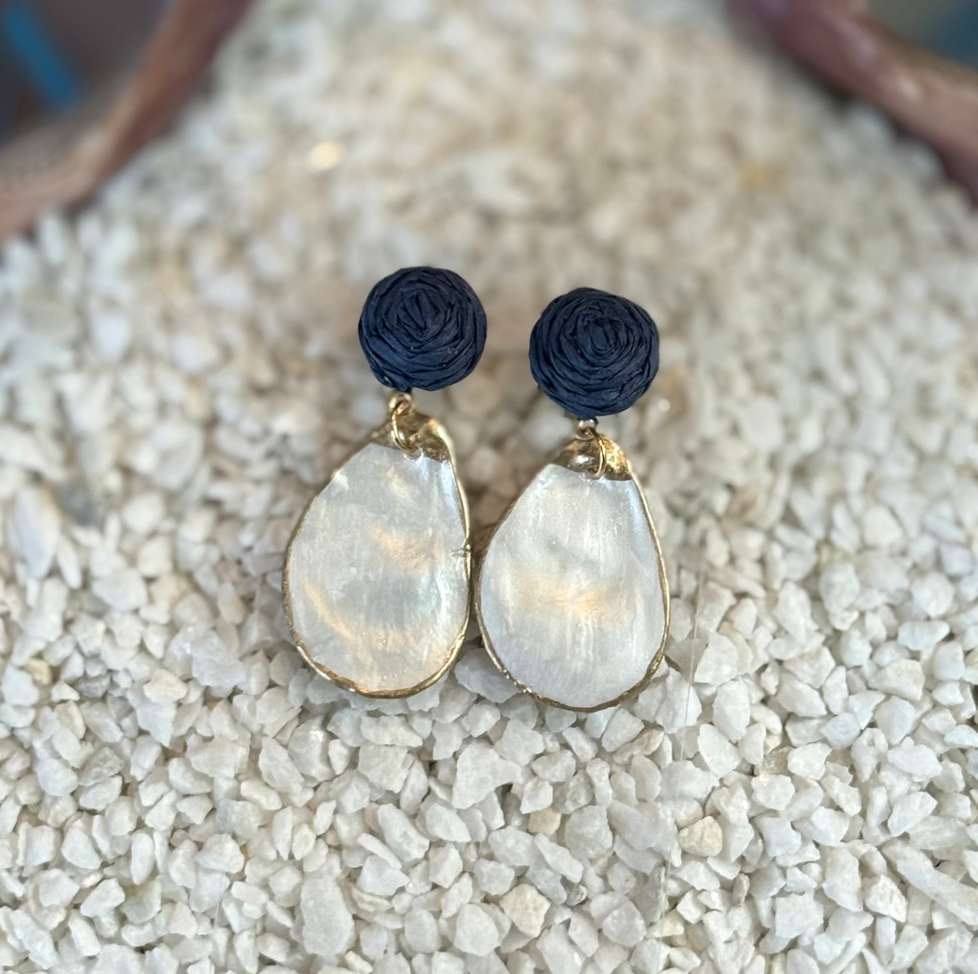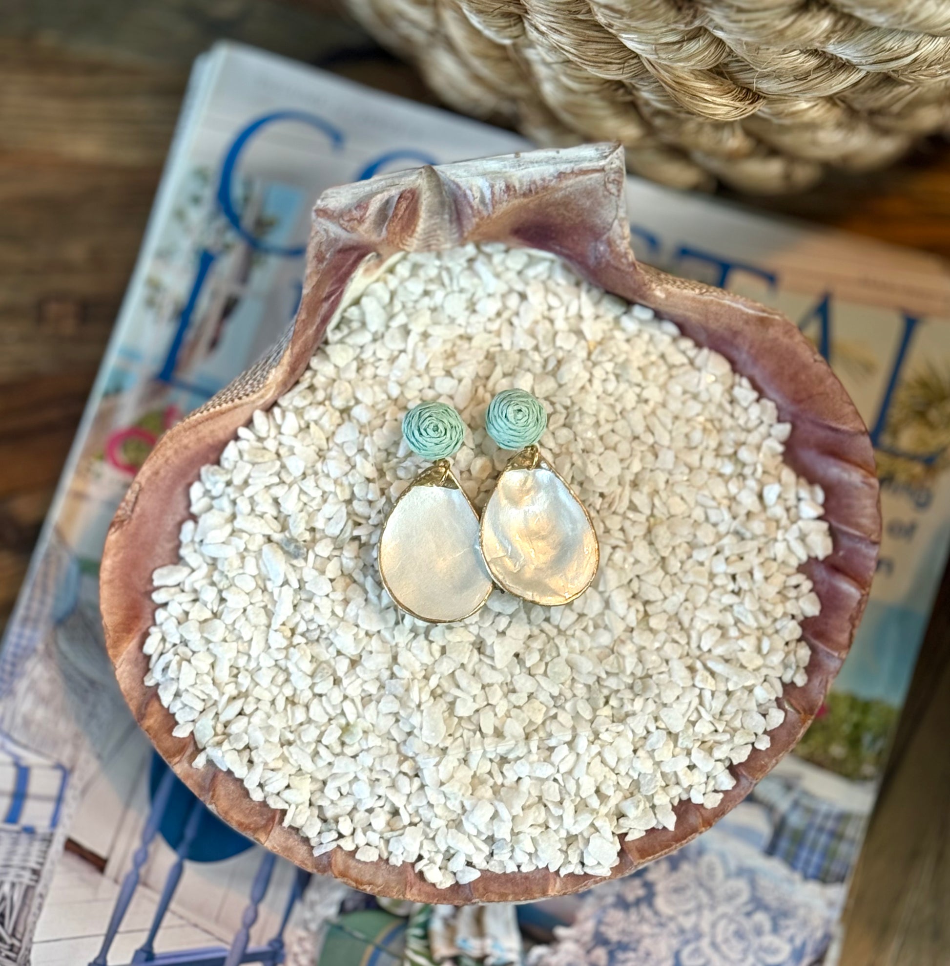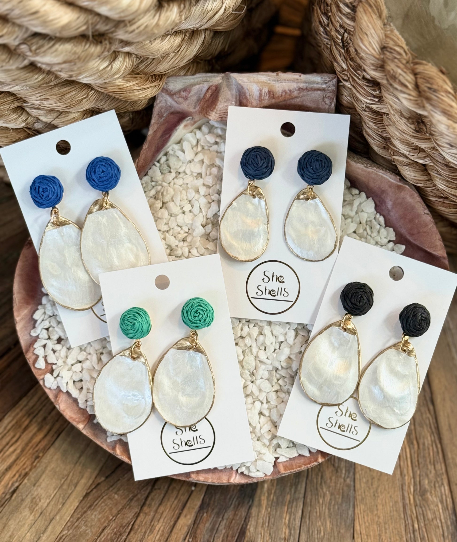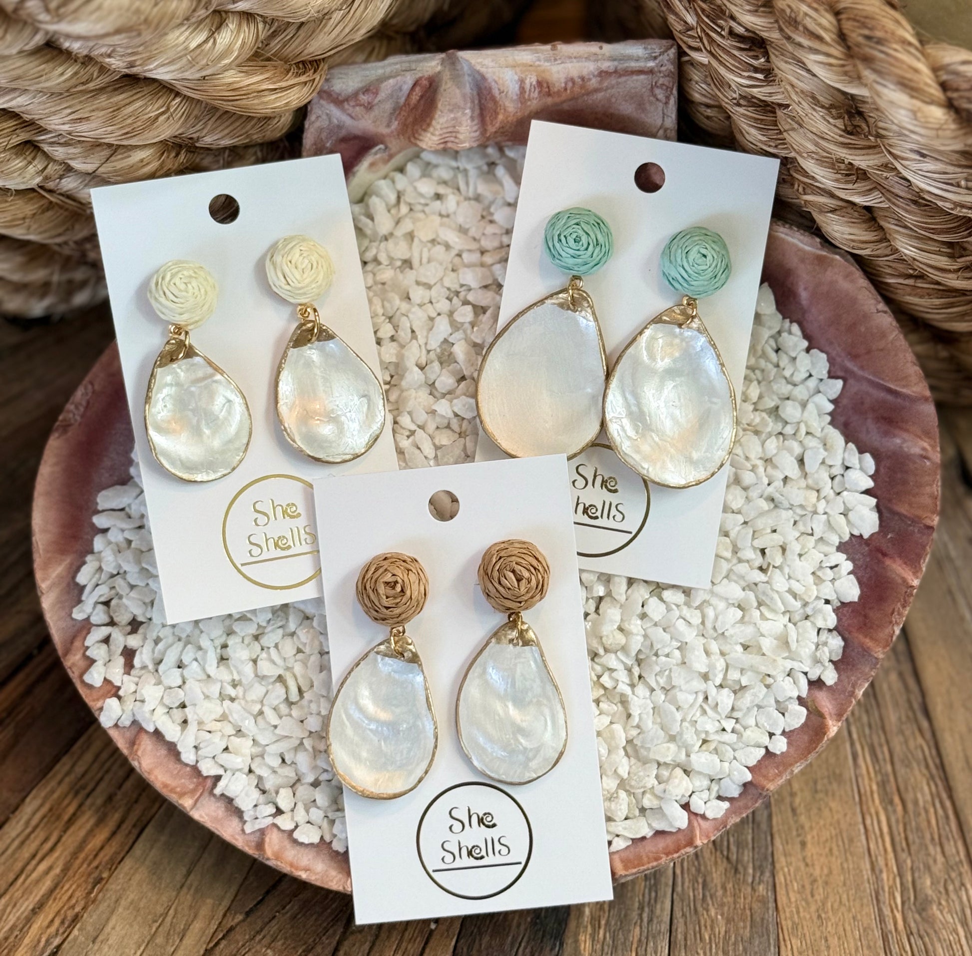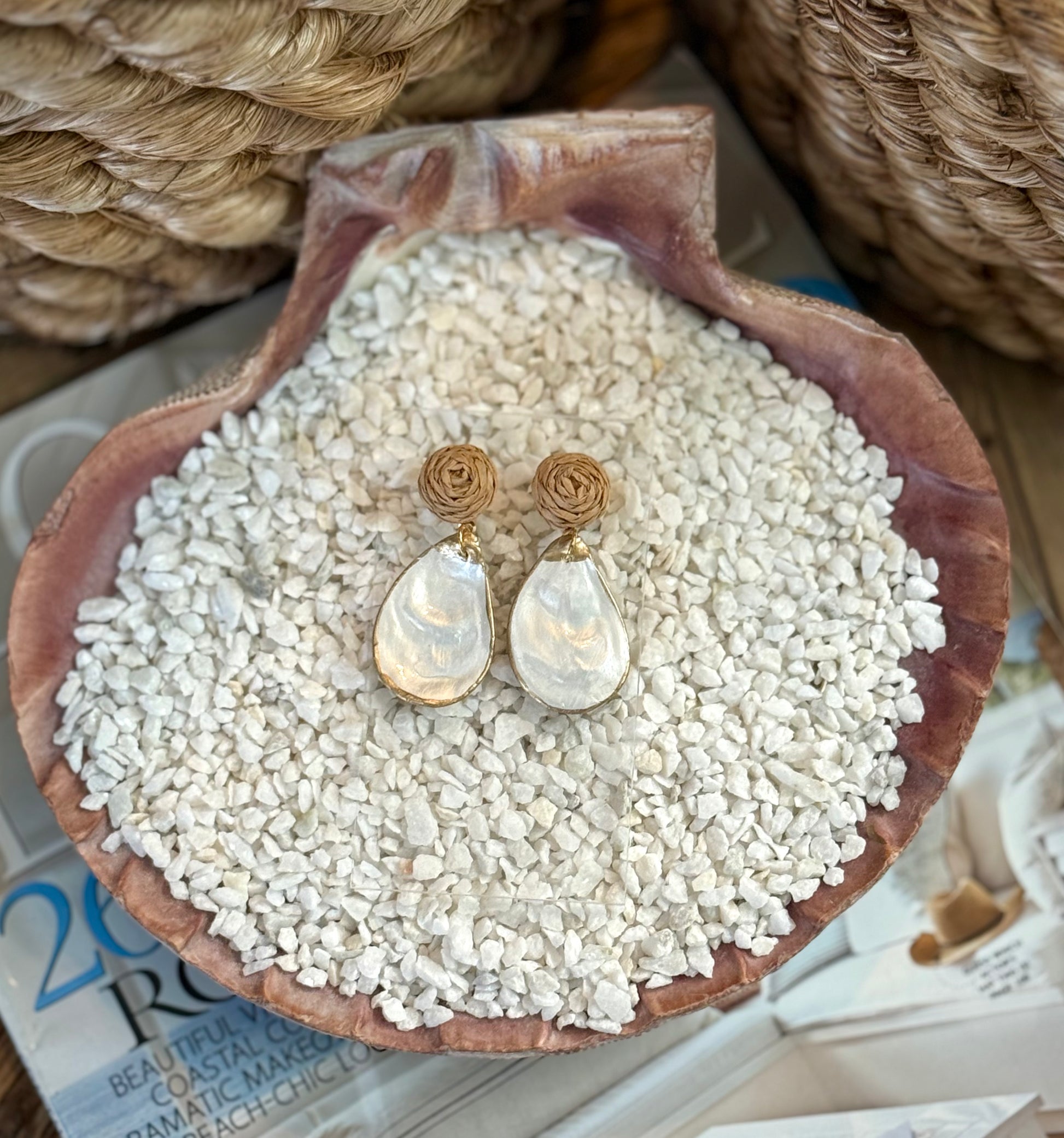 Coastal raffia posts embellish the tops of these seashells giving them a refined, natural look. Shells are left natural on the backside and are approximately 1.5-2.5” tall, shaped into universally flattering shapes. Signature gift wrap is always included!